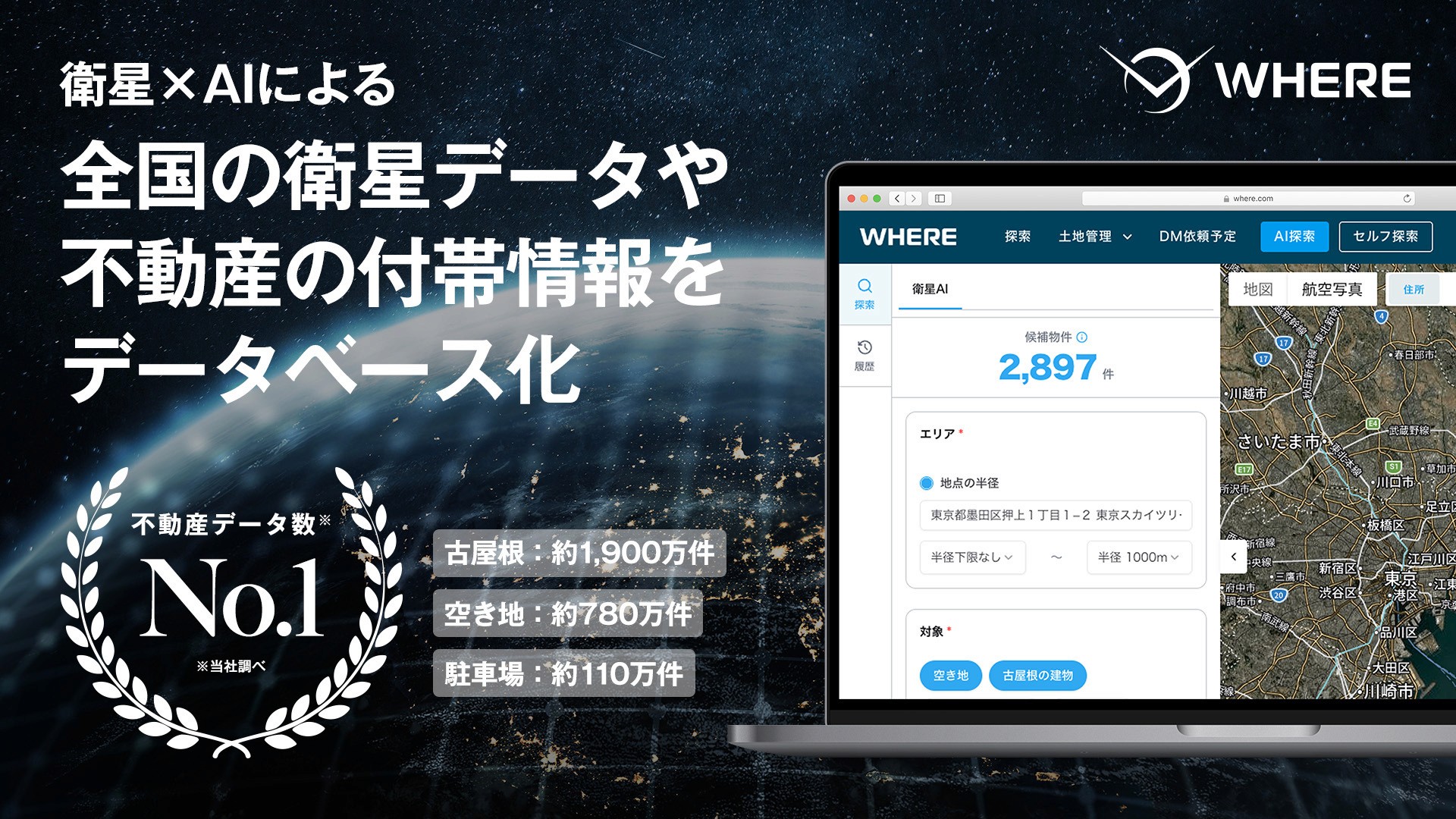 駐車場や空き地などの国内最大級の不動産データ約7,300万件を『WHERE』に統合し、指定した条件に合致する候補物件を数秒で把握することが可能です。
